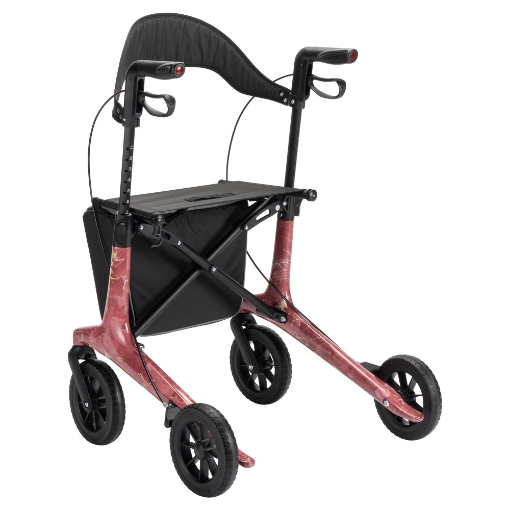 Naast functionaliteit onderscheidt deze rollator zich door zijn unieke uiterlijk. De marmer roze print geeft de rollator een moderne en stijlvolle uitstraling. Hierdoor oogt hij minder medisch en meer als een eigentijds mobiliteitshulpmiddel.